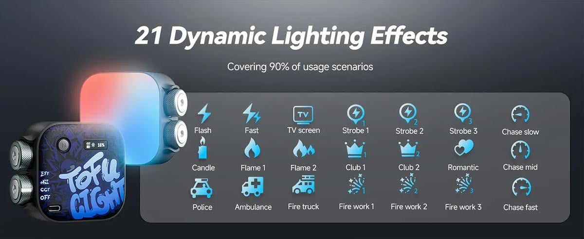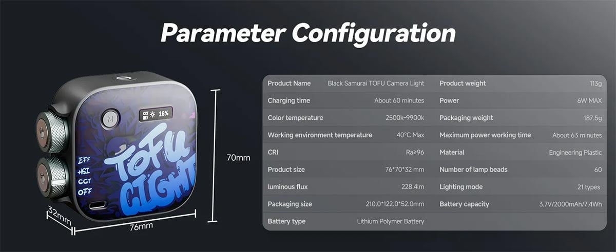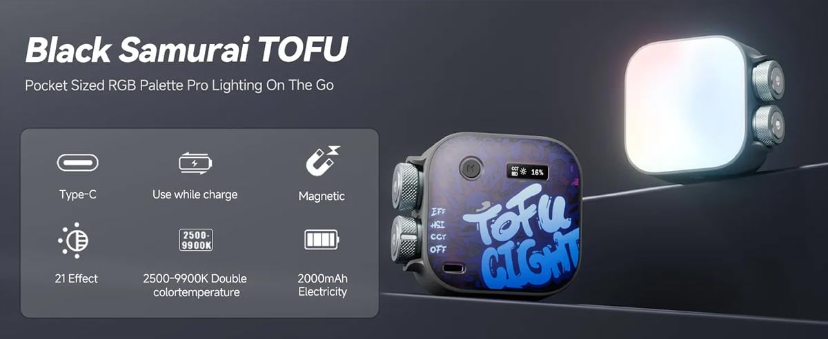 Photoolex Black Samurai TOFU Light, hem kompakt hem etkileyici bir RGB dolgu ışığıdır. Küçük boyutlu tasarımı ile taşınabilir, güçlü renk üretimi ile de yaratıcı projelerin vazgeçilmez ekipmanı haline gelir. Geniş ayar aralığı sayesinde video içerik üretiminden portre fotoğrafçılığına, yayıncılıktan mobil çekimlere kadar çok yönlü kullanım sunar.
