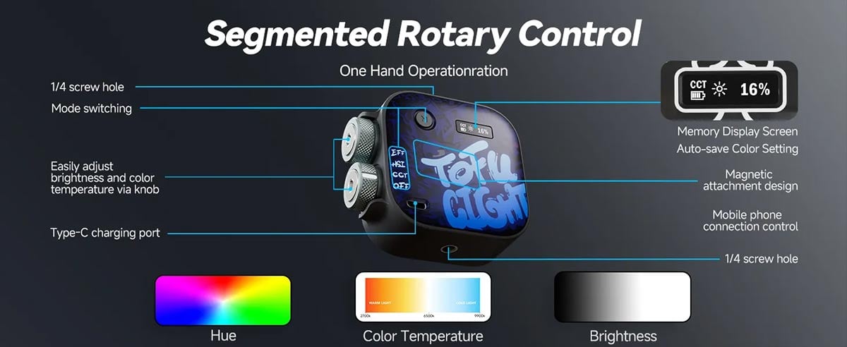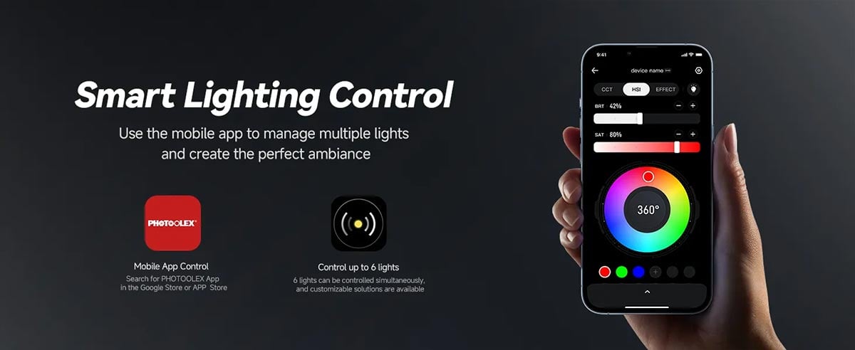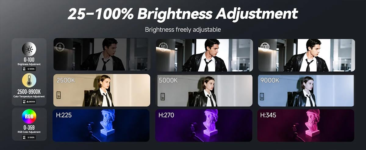 Işık panelinde yer alan RGB LED’ler ile 0°–360° renk tonu ayarı yapılabilir; bu sayede hayal gücünüzü sınırlayan tek şey yaratıcılığınızdır. Ayrıca sıcaklık aralığı 2500K’dan 9900K’ya kadar ayarlanabilir, böylece ister gündüz ışığı etkisi yaratabilir, ister soğuk mavi atmosferler kurabilirsiniz. Parlaklık kontrolü %1 ile %100 arasında yapılabildiği için hem oldukça güçlü ışık hem de zarif düşük ışıma oluşturmak mümkündür.