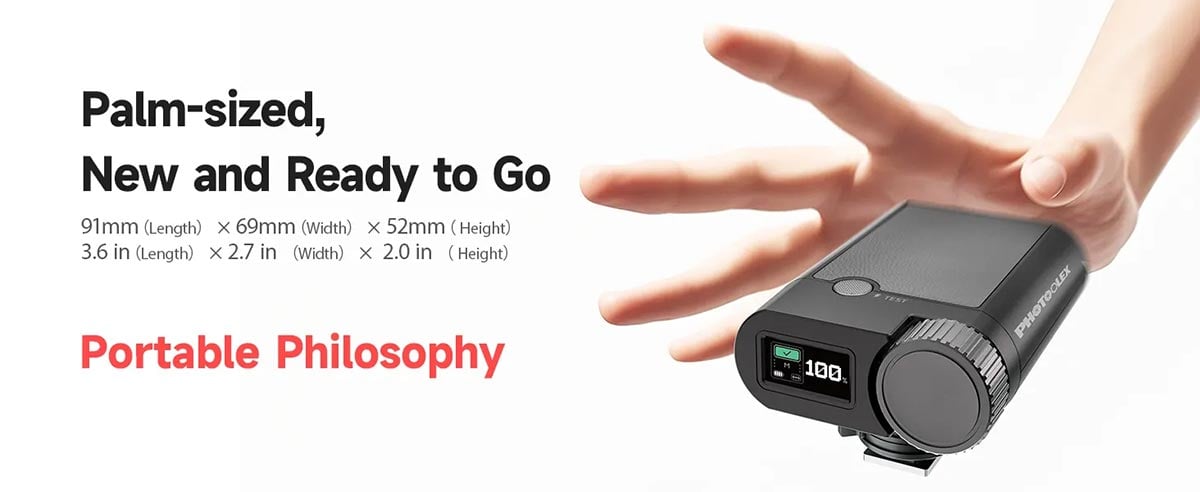 Boyutları 90×68×52mm, hot shoe montajı ile güvenli bağlanabilir, portatif kullanım sağlar.