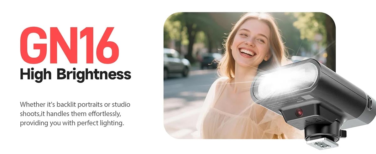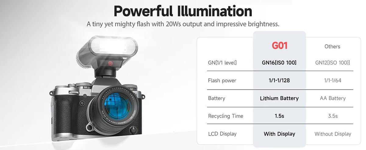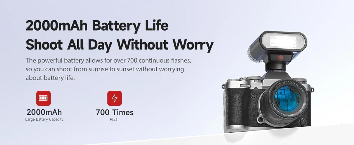 G01 Mini Speedlite, saniyeler içinde yeniden şarj olur ve uzun çekim seanslarında kesintisiz ışık sağlar. Tek bir şarj ile 800 tam güçlü flaş atabilir ve geri dönüş süresi 0.01-2.1 saniye arasında değişir.