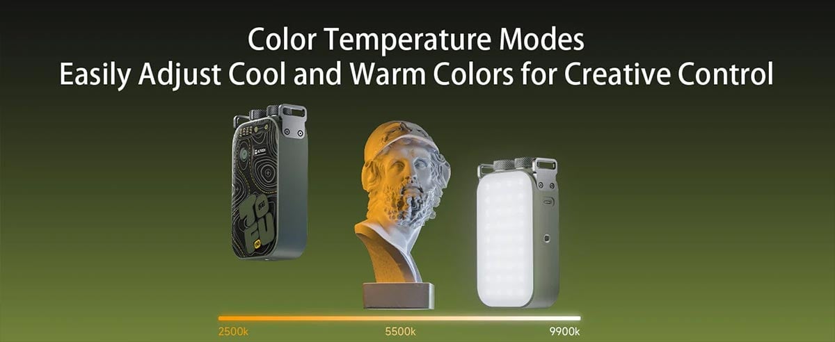TOFU-BRO, renk üretme konusunda tam kontrol sağlar. Renk tonu (Hue) 0°-360° arasında ayarlanabilirken, doygunluk %0-100 aralığında kontrol edilebilir. Parlaklık %1 ile %100 arasında hassas şekilde artırılıp azaltılabilir; 2500K – 9500K arasında geniş bir renk sıcaklığı aralığı sunar. Bu sayede ister sıcak amber tonlarında sinematik bir atmosfer, ister soğuk mavi ışıklarla modern bir görünüm oluşturabilirsiniz. Ayrıca HSI ve CCT modlarına ek olarak sahne modları da bulunduğundan içerik üretim sürecinde farklı efektler elde edilebilir.