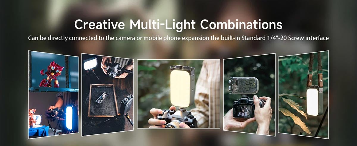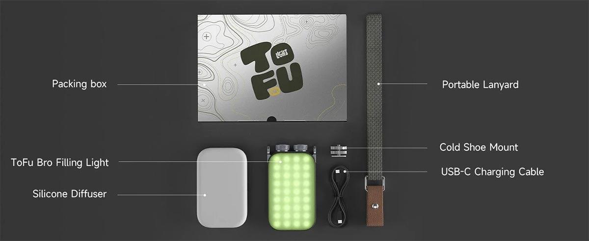 TOFU-BRO’nun farklı çekim koşullarına uyum sağlamasını kolaylaştıran birden fazla montaj seçeneği bulunur. Üzerindeki benzersiz metal askı halkası (lanyard loop) ışığın elde, çantada veya askıda taşınmasını sağlar. Yan ve alt kısmında yer alan 1/4”-20 vida yuvaları sayesinde tripod, kamera kafası, stabilizer veya ışık koluna güvenle bağlanabilir. Kutudan çıkan soğuk ayakkabı (cold shoe) aparatı ile Nikon, Canon, Sony, Fujifilm gibi fotoğraf makinelerine uyumludur. Ayrıca pakete dahil edilen silikon difüzör, ışığı yumuşatarak gözü rahatsız etmeyen, portre ve yakın plan çekimlerde ideal sonuçlar sunan daha homojen bir dağılım sağlar.